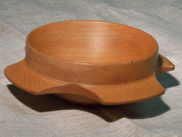 Wir haben uns Holzschalen drechseln lassen. Von einem Drechslermeister der schon für diverse Museen Restaurierungsarbeiten geleistet hatte und sich dadurch mit vielen archäologischen Funden auseinandergesetzt hat. Er hat die Schalen im Naßholzdrechselverfahren hergestellt. Durch dieses Verfahren verziehen sich die Schalen leicht beim Trocknungsprozess. Entweder wurde die Verformung so gelassen oder die Schalen wurden nach dem Trocknen noch einmal leicht übergedrechselt. Warum Naßholzdrechseln ? Kraftaufwand bei der Zerspanung um Faktor 1:10 geringer als bei trockenen Holz. Langwieriges trocknen und Gefahr der Rissbildung im Ausgangsmaterial entfällt. |